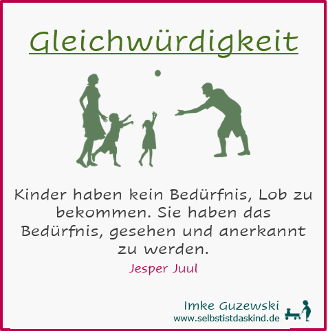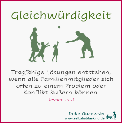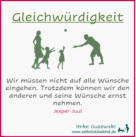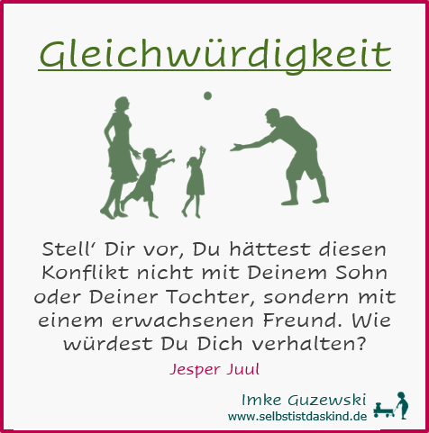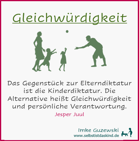 Gleichwürdigkeit ist ein von Jesper Juul entwickeltes Wort. Es bedeutet, dass Menschen die gleiche Würde besitzen, jedoch nicht unbedingt die gleichen Rechte. Und genau diese Differenzierung ist im Umgang mit Kindern so wichtig.